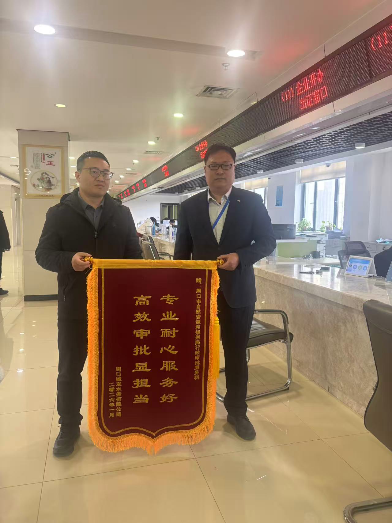 近日,周口城发水务有限公司项目负责人将一面印有“专业耐心服务好,高效审批显担当”的鲜红锦旗送至市自然资源和规划局行政审批窗口,以真挚情谊致谢本单位在项目审批全流程中提供的优质服务,彰显政企同心共促发展的良好氛围。