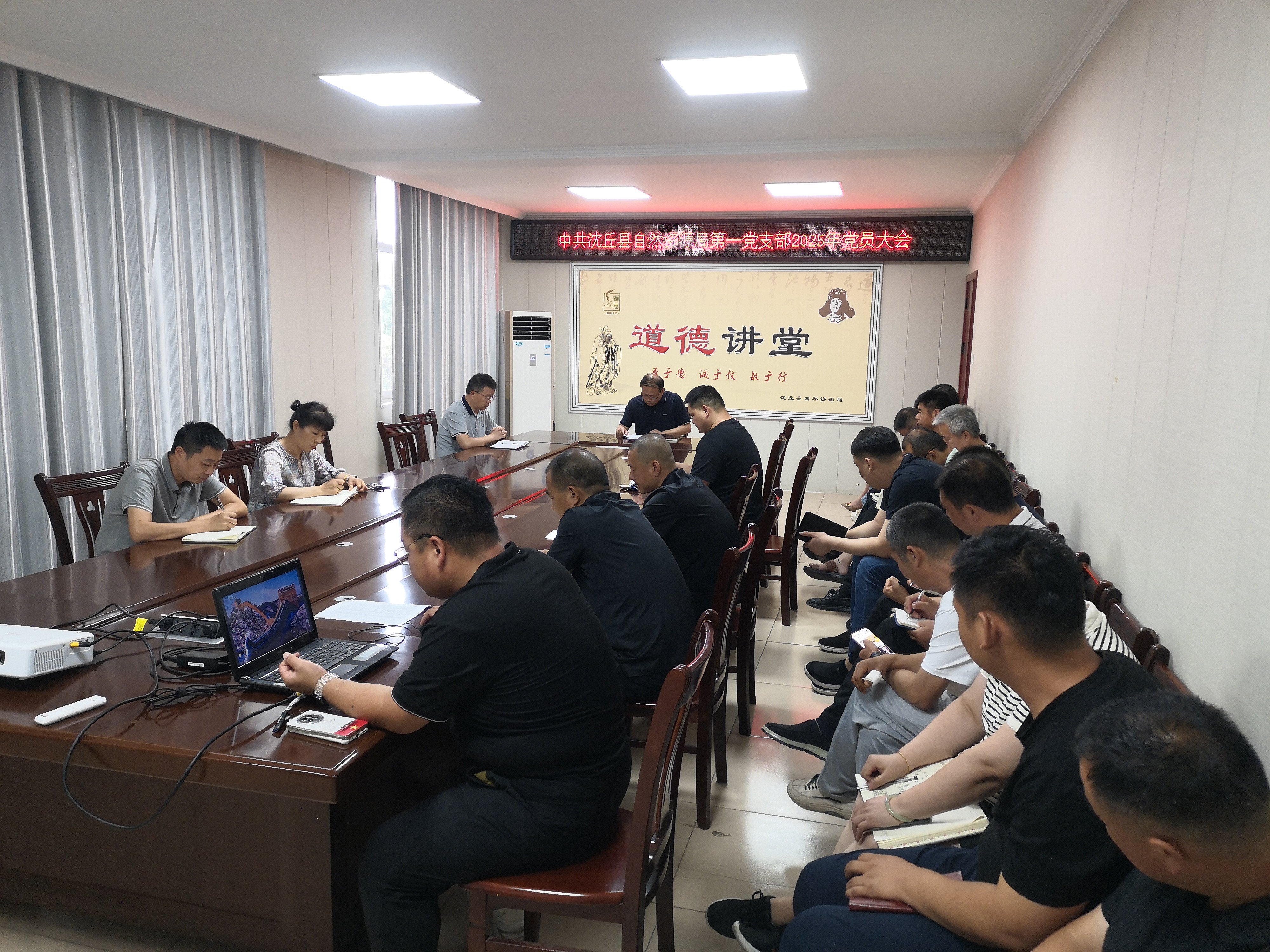 7月7日,沈丘县自然资源局第一党支部召开党员大会,会议由党支部书记主持,全体党员参加,局主要负责人以普通党员身份参会。