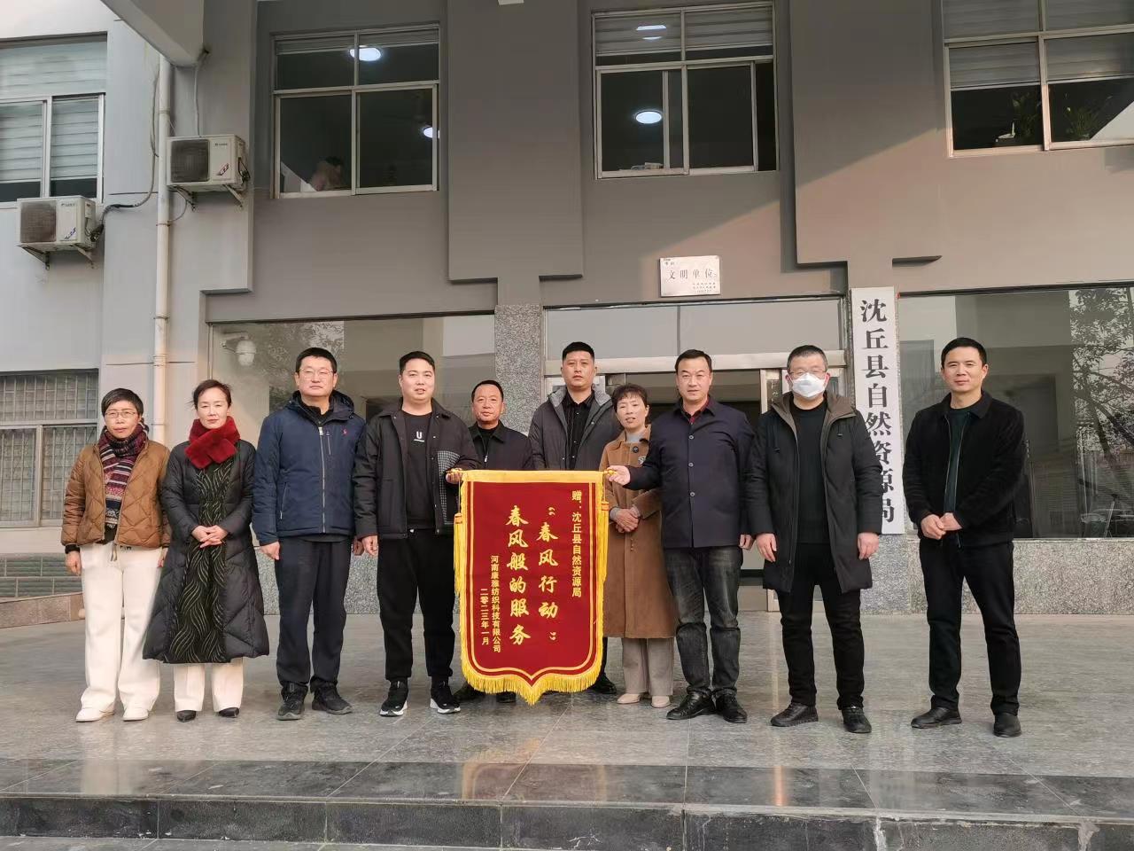 “这次我代表企业,专程来对你们热情的服务态度和高效的办事效率‘点赞’。”1月9日,周口大唐伟业房产有限公司、河南康雅纺织科技有限公司和沈丘县三槐房地产开发有限公司(麒麟府)分别为沈丘县自然资源局送来“为企解忧效率高 热情服务态度好”、“‘春风行动’春风般的服务”、“春风行动暖人心 廉洁高效顺民意”三面锦旗,对县自然资源局的热情高效服务表示感谢。