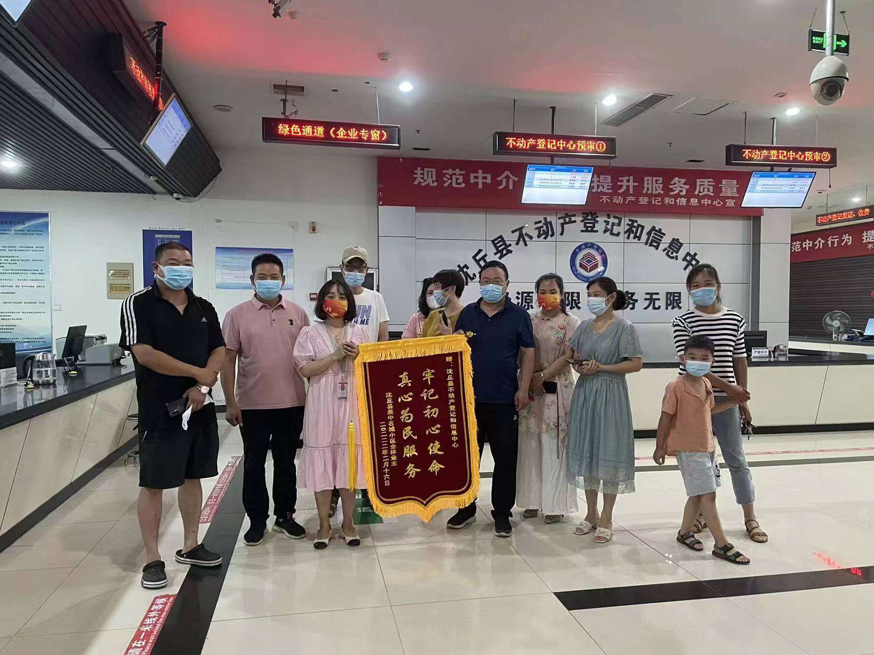 “感谢你们,解决了我们小区这么多业主多年来心头上的麻烦事儿。”7月5日,沈丘县昊中名城小区业主代表将一面写有“牢记初心使命 真心为民服务”的锦旗送到沈丘县不动产登记和信息中心,对工作人员尽心竭力、主动热情、高效快捷的工作作风表示感谢。