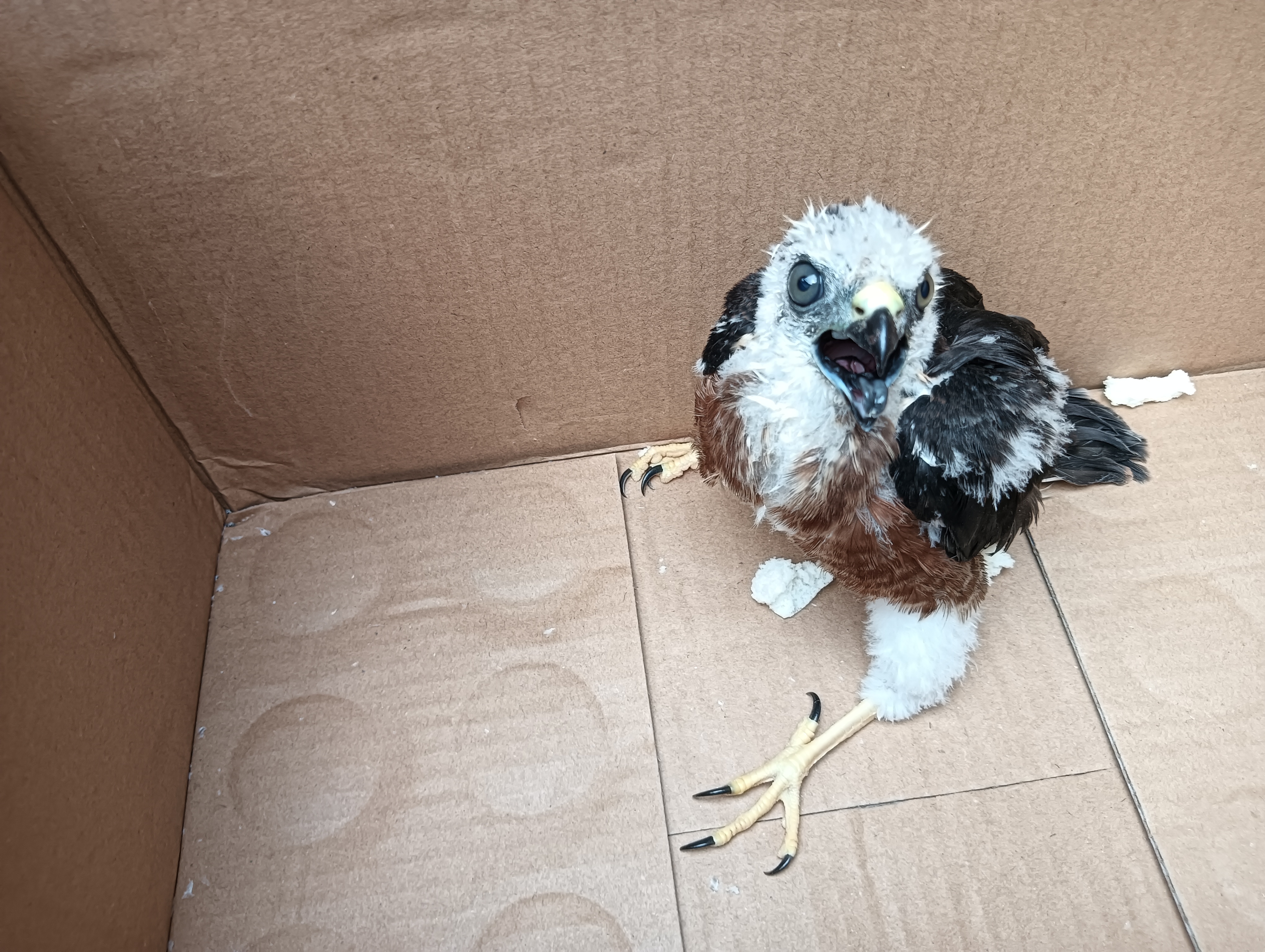 7月19日,项城市王明口派出所向项城市自然资源和规划局野保股工作人员移送了一只猛禽雏鸟,为当地群众在野外发现并救助。当看到弯曲带钩的黑嘴和尖锐锋利的爪子,大家都认为是一只燕隼的雏鸟。野保股工作人员发现该鸟不具备隼科鸟类所特有的圆形鼻孔及鼻内骨突,排除了燕隼的可能。仔细观察,发现该猛禽有黑色眼影、黑色背羽和白色腿羽,与之前救助的黑翅鸢有几分相似。但其腿部较细,爪部细短,抓握力弱,与黑翅鸢粗壮有力的腿爪相距甚远,很显然该鸟不是黑翅鸢。观察其褐色胸羽及细长腿部,又像是松雀鹰,但是褐灰色的虹膜不是松雀鹰所具备的。
