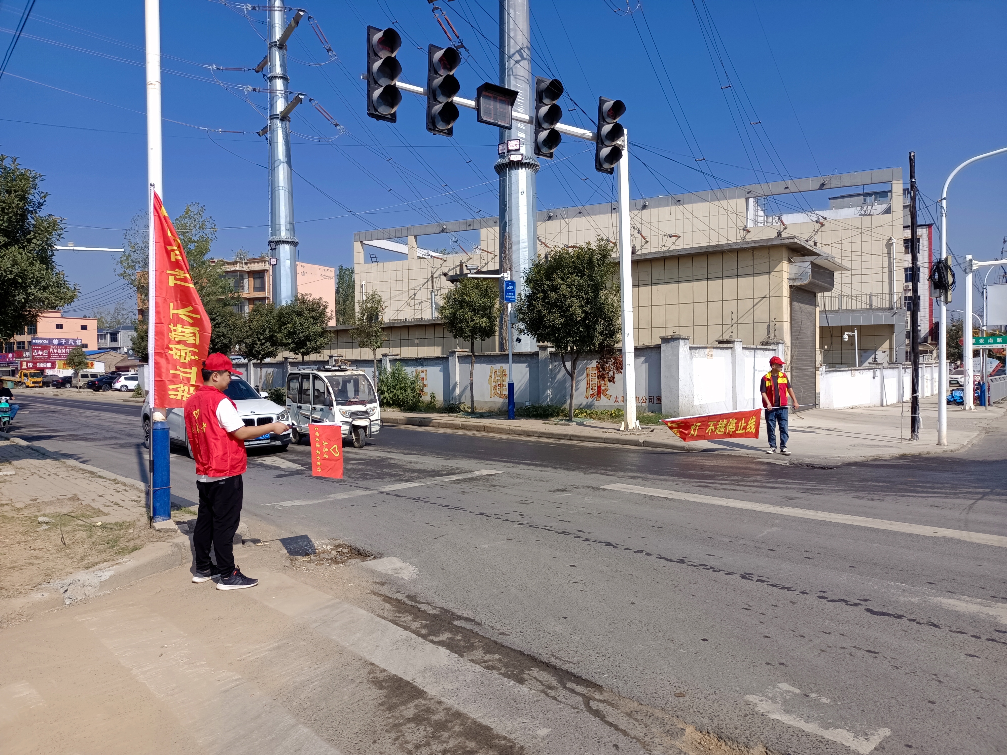 在太康县城建设南路红绿灯路口,志愿者们主动放弃“国庆”假日等休息时间,身穿红马甲、挥舞着文明交通宣传的小红旗轮流值守,维护交通秩序,劝阻在十字路口闯红灯、乱穿马路的电动车和行人,并对经过路口的行人进行交通疏导,提醒路人遵守交通规则,注意安全,路口交通秩序井然。