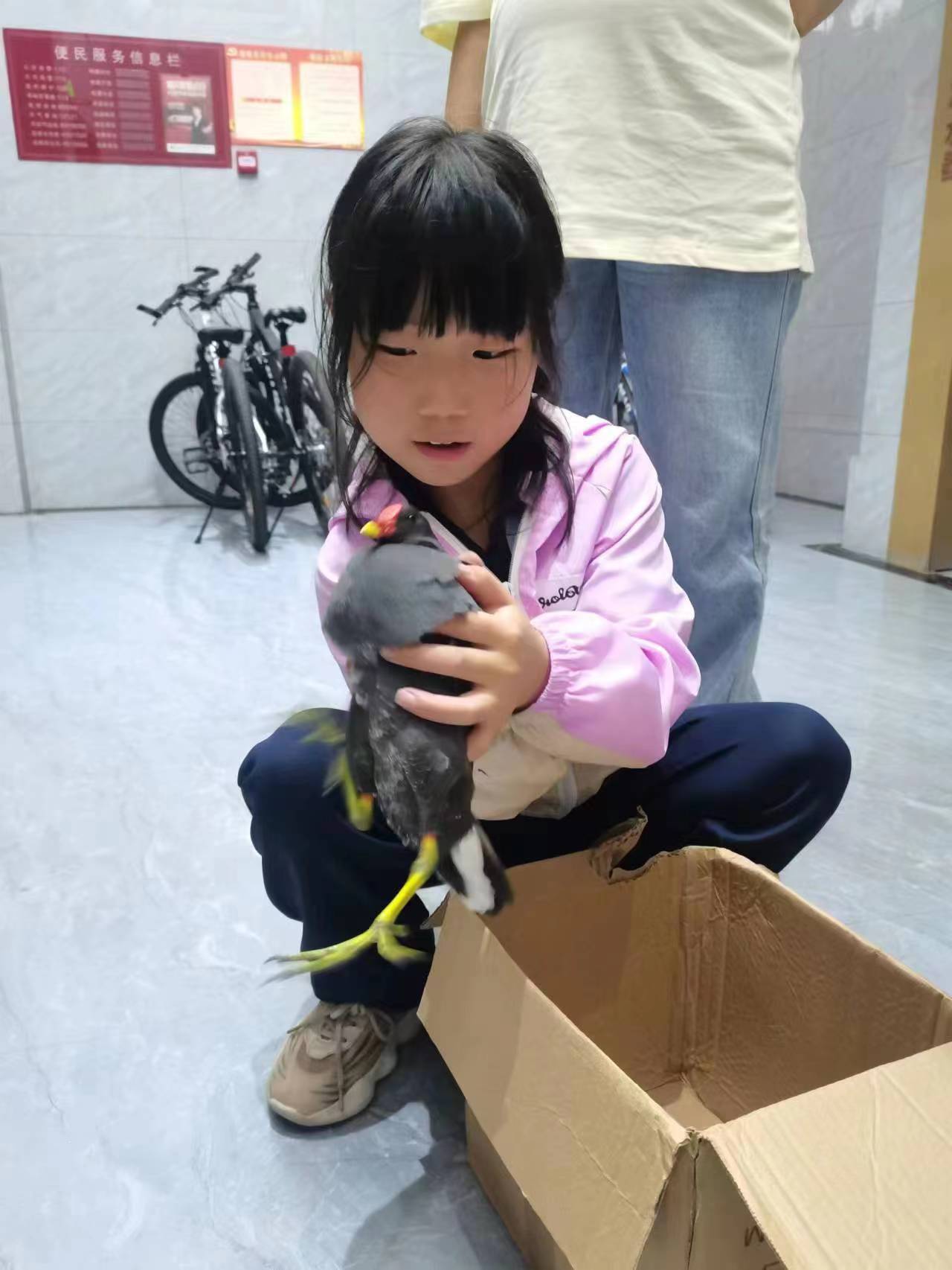 5月29日傍晚7时许,项城市公园路学校的付婧博同学在住宅小区门口角落处,发现一只黑色的鸟卧在地上一动也不动,她赶紧喊来了爸爸妈妈一同把它放进纸箱里,并及时报警求助。