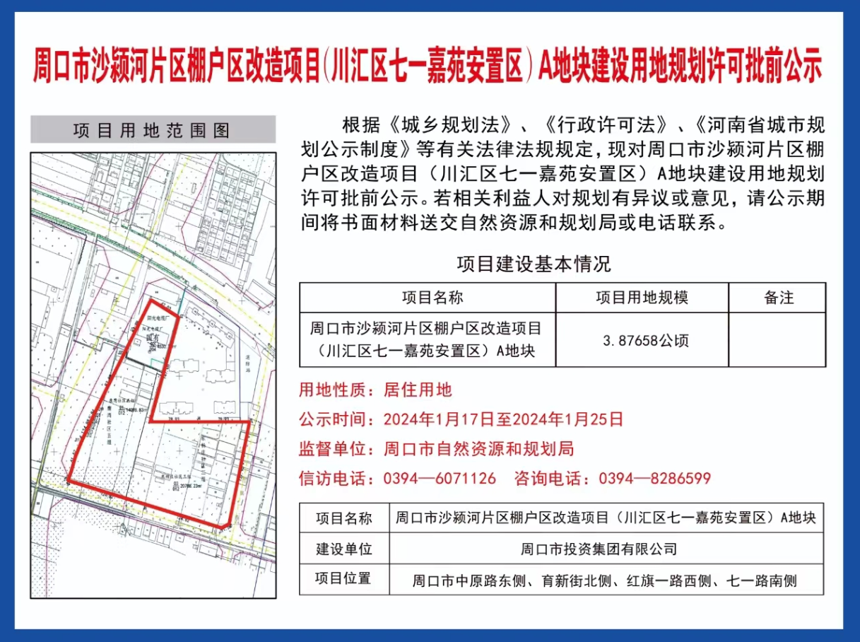 周口市沙颍河片区棚户区改造项目(川汇区七一嘉苑安置区)A地块建设用地规划许可批前公示