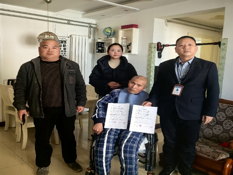 工作人员一边耐心解读政策、逐条记录需求,一边敏锐捕捉到老人“异地居住、行动受限、亲属缺位”的特殊困境。工作人员立即向中心负责人专题汇报,果断启动特殊群体服务预案,选派两名业务骨干组成专项服务小组,即刻驱车奔赴郑州。为确保服务一次到位,工作人员在途中再次与陈老先生视频连线,逐项核对身份证、法院裁决书等材料清单,细致叮嘱注意事项。抵达老人住所后,两名工作人员特意放慢语速、放大材料字体,全程弯腰俯身讲解流程,手把手带着老人逐字填写申请表,连签名的位置都用铅笔轻轻标记。